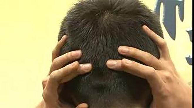 【方法】:用右手拇指尖在百会穴点按,待局部产生重胀麻感后立即改用拇指腹旋摩,如此反复交替进行约30秒,紧接用掌心以百会穴为轴心,均匀用力按压与旋摩约30秒。