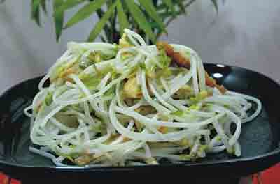 【原料】新鲜绿豆芽500克,花椒少许几粒,植物油、白醋、食盐、味精适量。