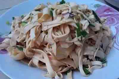 【做法】豆皮切丝,葱洗净切丝。油锅烧至6成热,葱丝下锅,烹出香味,将豆皮丝入锅翻炒,随后加食盐,炒数分钟后,加味精,淋上香油搅匀出锅。
