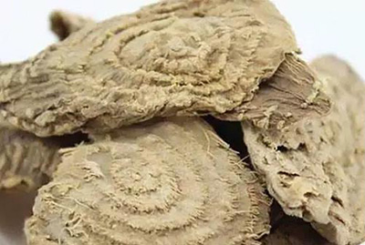 性状鉴别:为横切或纵切的不规则块片,厚薄不等。外皮灰黄色或灰棕色。横切片弯曲不平,边缘皱缩,直径2~8cm;切面浅黄棕色或黄白色,木部隆起,形成数个突起的同心性环轮。纵切片弯曲或卷曲,长5~8cm,宽1~2cm,木部呈平行条状突起。质硬。气微,味稍甜,久嚼麻舌。