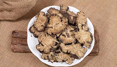 性状鉴别:本品为不规则结节状拳形团块,直径2~7cm。表面灰褐色或褐色,粗糙皱缩,有多数平行隆起的轮节,顶端有凹陷的类圆形茎痕,下侧及轮节上有多数小瘤状根痕。质坚实,不易折断,断面黄白色或灰黄色,散有黄棕色的油室,形成层环呈波状。气浓香,味苦、辛,稍有麻舌感,微回甜。